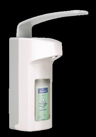 Moderner Kunststoffspender zur Wandmontage für die Benutzung von hygienischen Einweggebinden mit Einmalpumpen mit langem Auslauf, welche die zeitaufwändige Aufbereitung überflüssig macht.